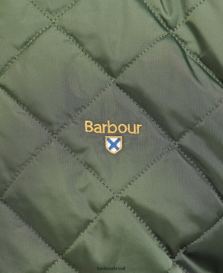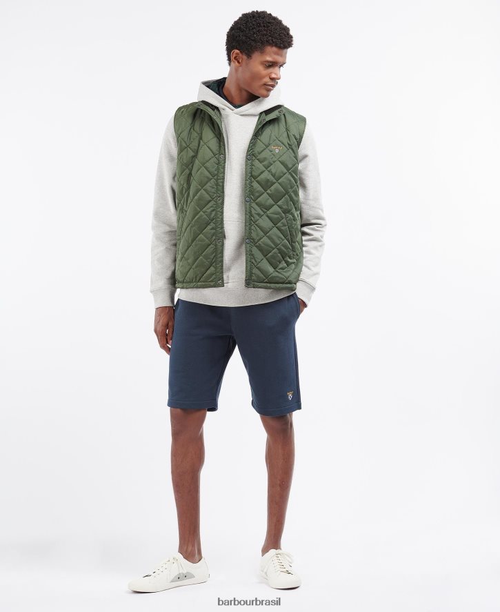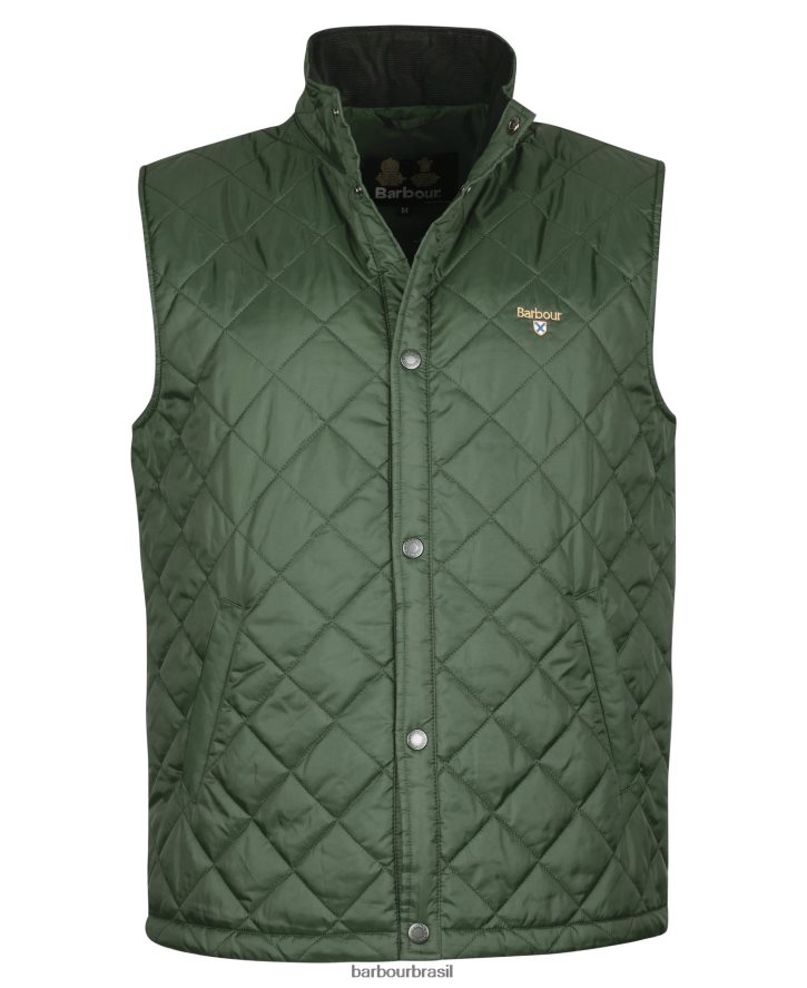 o colete com crista barbour apresenta um design de colcha de caixa com gola alta e fecho frontal com botões, apresentando dois bolsos embutidos inferiores e um bolso interno de patch, finalizado com marca à esquerda do peito.